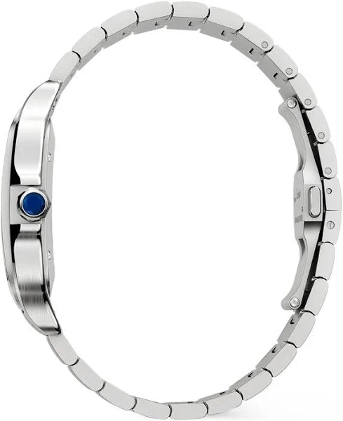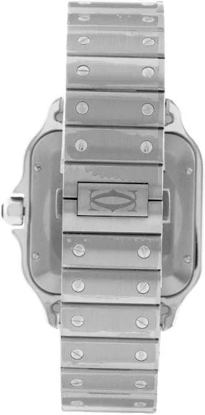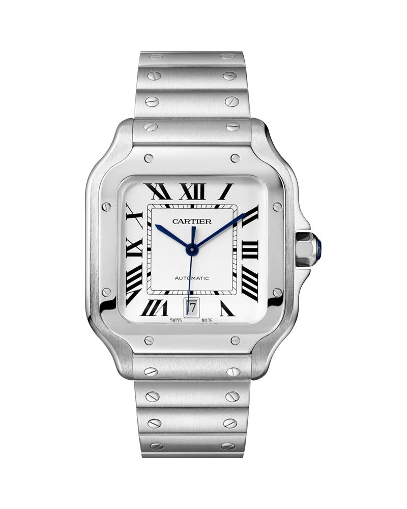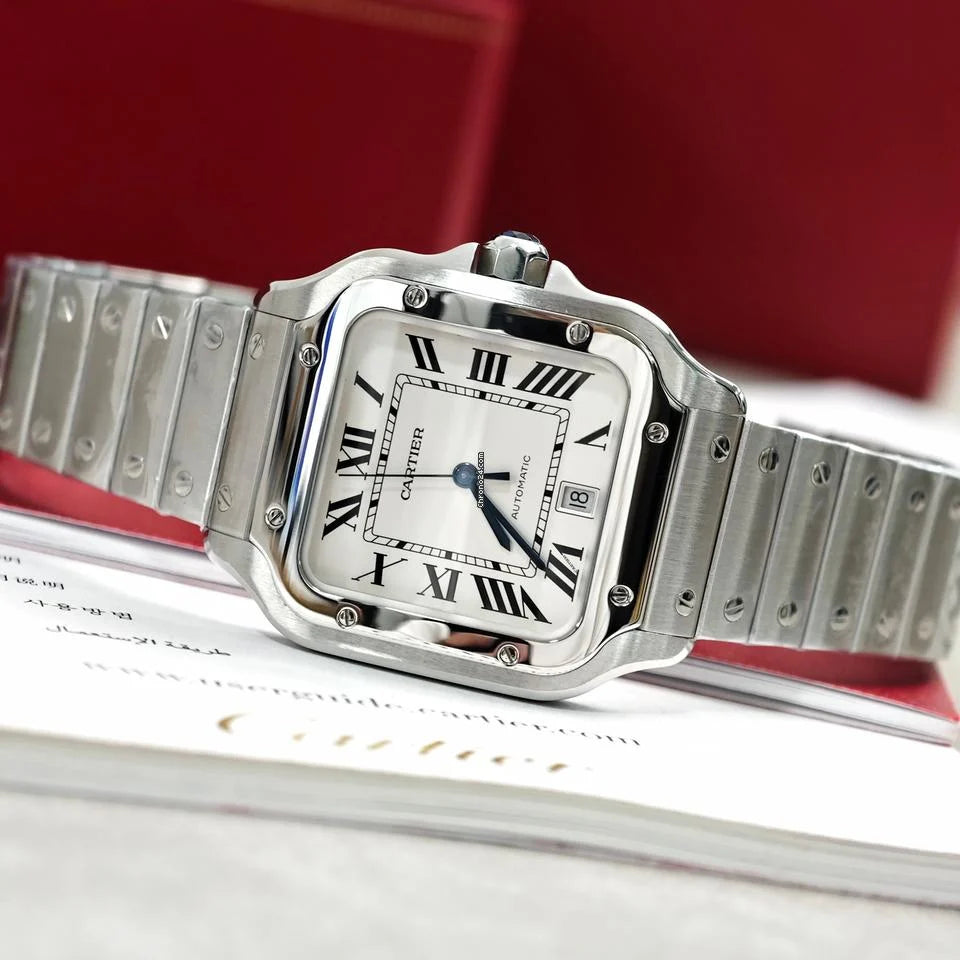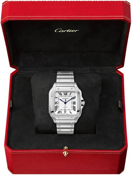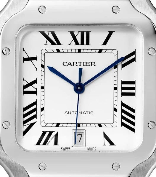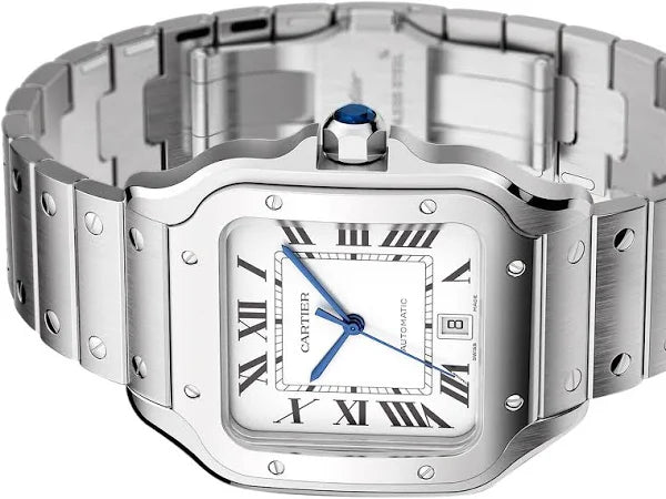 This sophisticated timepiece from the Santos de Cartier collection showcases a distinctive 35.1mm square dial with silvered opaline finish and polished steel sword-shaped hands. The iconic 7-sided crown, adorned with a faceted synthetic spinel, defines its elegant aesthetic. Powered by an automatic movement, the watch features a robust steel bracelet complemented by calfskin leather options. Protected by synthetic sapphire crystal and rated for 100m water resistance, it delivers both durability and refinement. The WSSA0029 model is backed by up to eight years of International Limited Warranty, ensuring long-term peace of mind for discerning collectors.